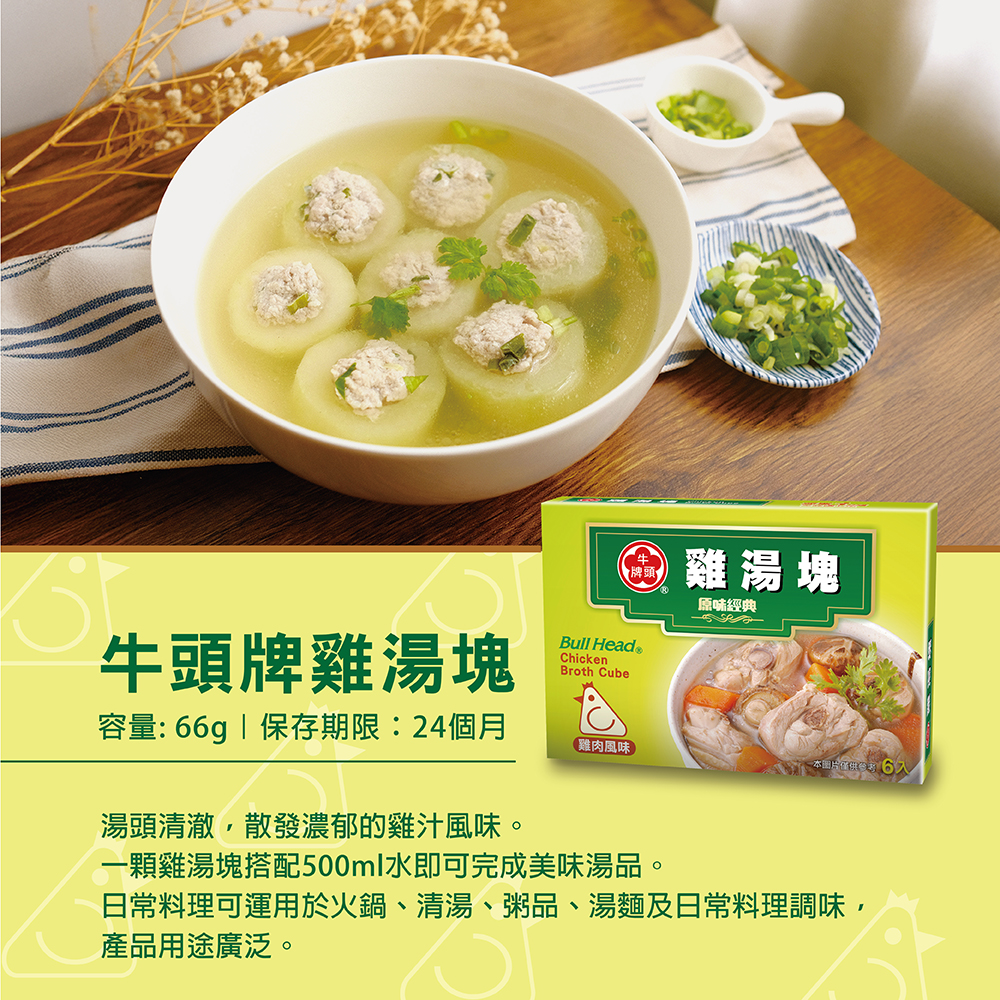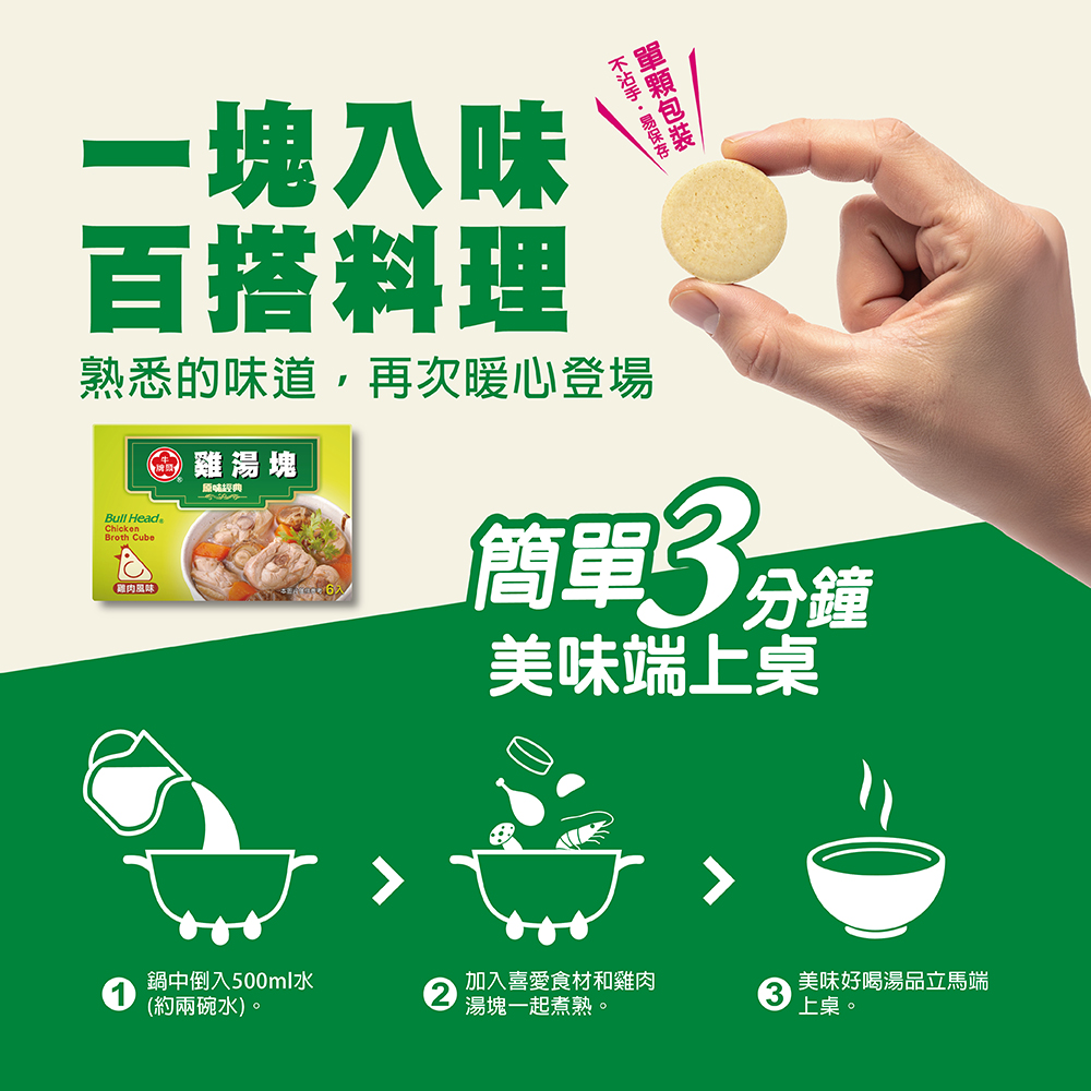 湯頭清澈,散發濃郁的雞汁風味,一顆雞湯塊搭配500cc水即可完成美味湯品。以完全密封泡殼包裝設計,使用方便不沾手,攜帶更便利。雞湯塊可運用於火鍋、清湯、粥品、湯麵及日常料理調味,方便又美味。