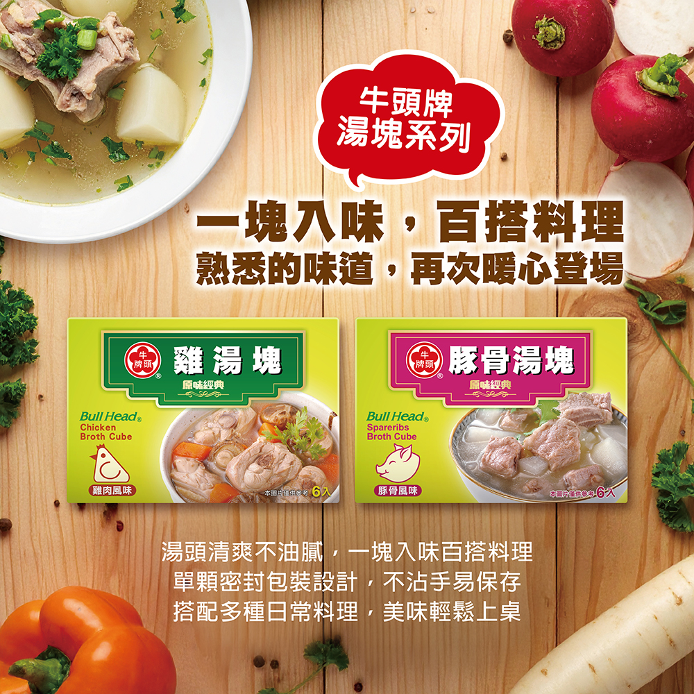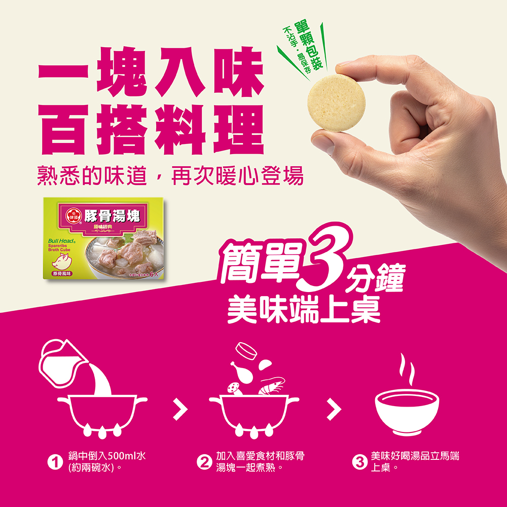 湯頭清爽不油膩,散發濃郁的豬肉風味。一顆豚骨湯塊搭配500cc水即可完成美味湯品。日常料理可運用於火鍋、清湯、粥品、湯麵及日常料理調味,產品用途廣泛。