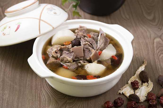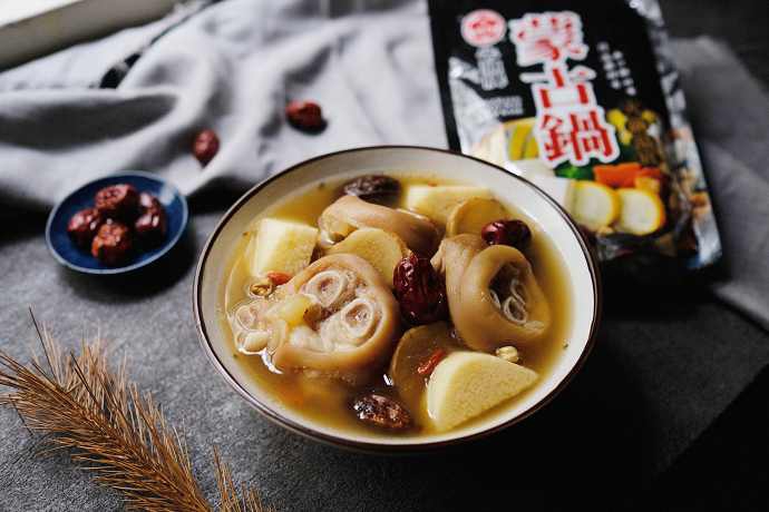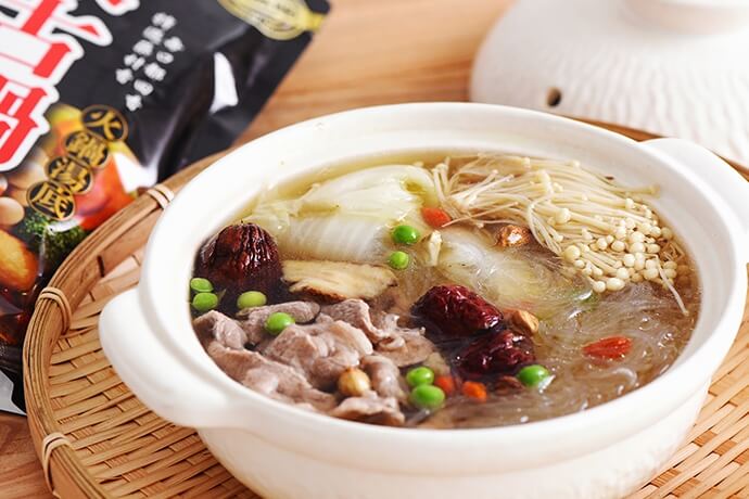 以濃縮高湯包加入中藥材調和,加入紅棗、當歸、草果、枸杞、白荳蔻、孜然六種中藥材共同熬煮,香醇濃郁,無須調味在家即享美味火鍋湯底。高溫高壓滅菌,無添加防腐劑,可常溫保存。搭配1000cc水共同熬煮,即可完成美味湯底。適合製作藥膳冬粉湯、藥膳羊肉湯與蒙古雞湯等多樣料理。