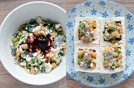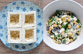 將板豆腐切成四塊,並挖出適量豆腐。 將挖出豆腐、蝦仁丁、玉米粒、蔥花拌勻。