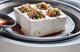 放入電鍋,再將薄鹽醬油與少許沙茶油拌勻後,舀入蒸盤盤緣進行蒸煮。將蒸盤中的醬汁淋上豆腐即可裝盤食用。