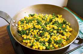 鍋中加入菠菜、玉米粒、鹽、胡椒拌炒