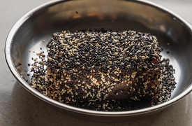 將醃漬好的鮪魚,六面均沾裹上芝麻。