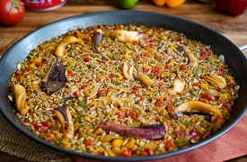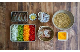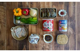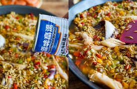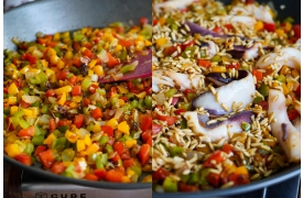 彩椒、青椒和洋蔥切丁;大蒜切末;透抽切塊;蝦子剪蝦鬚、去腸泥;雞腿排切成一口大小後以黑胡椒及鹽簡單抓醃、麥仁泡水;同時將番紅花放入少許熱水中浸泡出色。