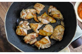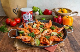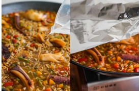 將燉飯裡的食材稍稍擺盤,依序放上蝦子和雞腿;再次將鍋蓋蓋上,或是包上一層錫箔紙,燜5分鐘即可上桌。