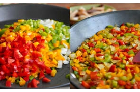 鍋中放入一大匙橄欖油下鍋製作底醬;放入彩椒、青椒、洋蔥和大蒜先行拌炒