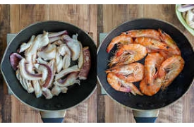 鍋中放入一大匙橄欖油,以中小火將軟絲煎熟、蝦煎至上色後取出待用