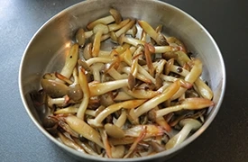 鴻禧菇剝散,用小火將鴻禧菇煎至褐色,外表焦脆後備用。