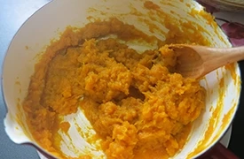 蒸好的南瓜放入鍋中壓成泥